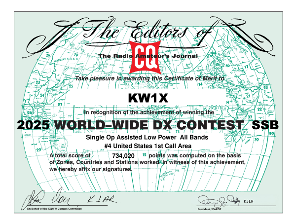 CQ WORLD WIDE DX SSB 2025 February 9, 2026 by admin Single Operator, Low Power 734,020 points from 778 QSOs, 267 Countries and 76 Zones in 11.0 hours of operation.